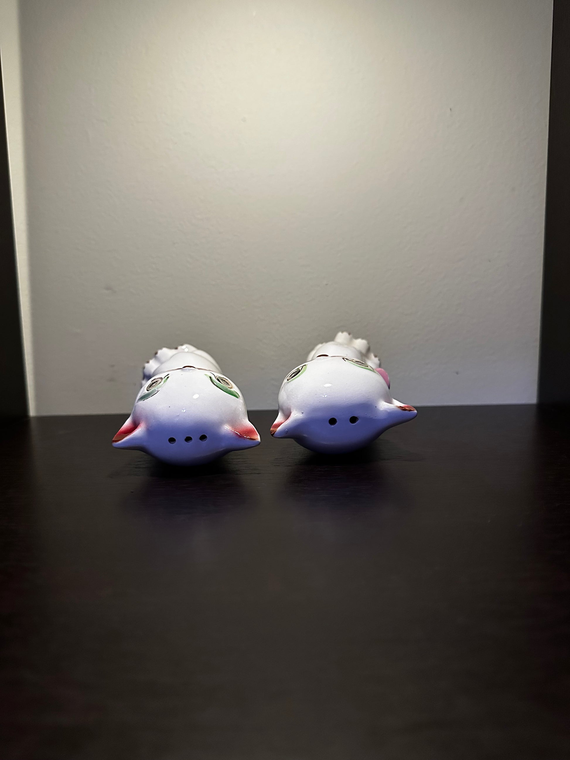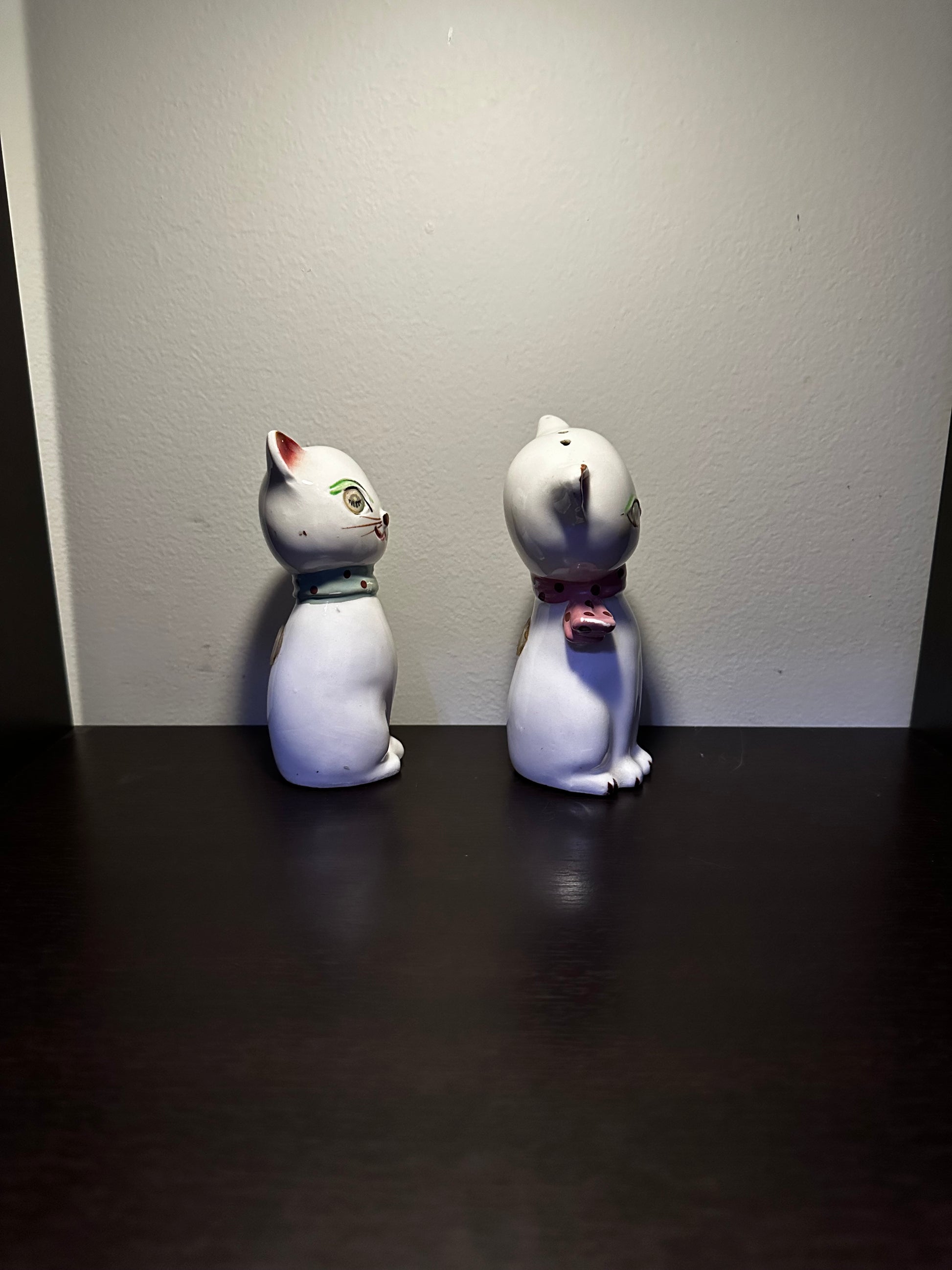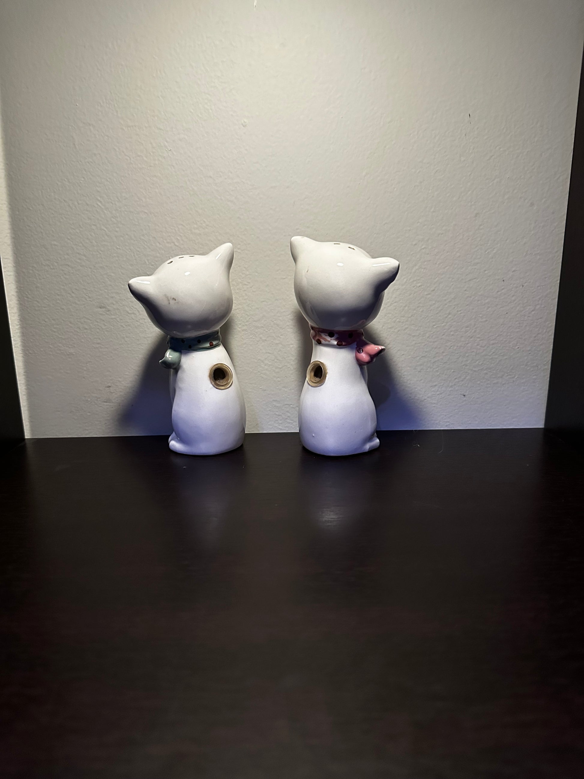 Super cute vintage "Cozy Kitten" salt and pepper shakers by Holt Howard, made in 1958. These two cuties are fully intact, with amazing detail and only a few smudges on either one of them, and they wink! Both still have the sound box inside, however I don't believe they make sound anymore.